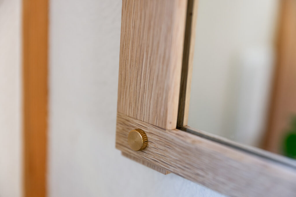 オーク材で作った、小さな棚とフックがポイントのウォールミラーです。